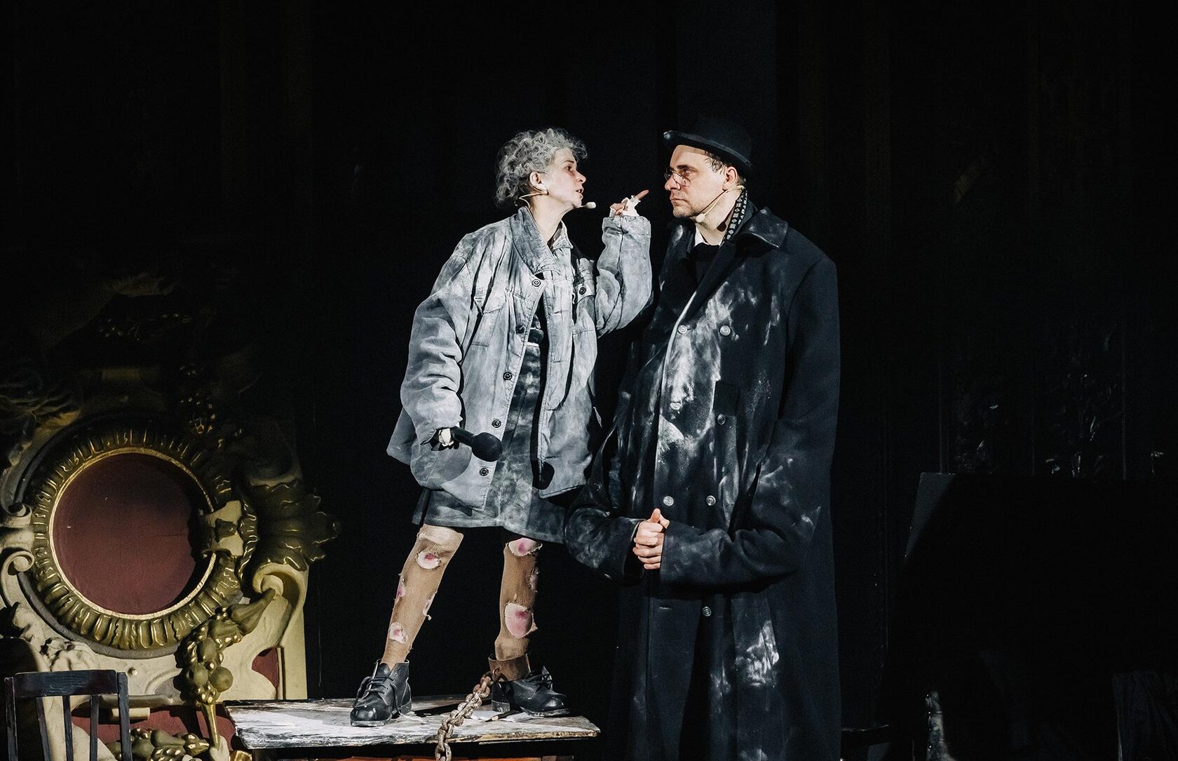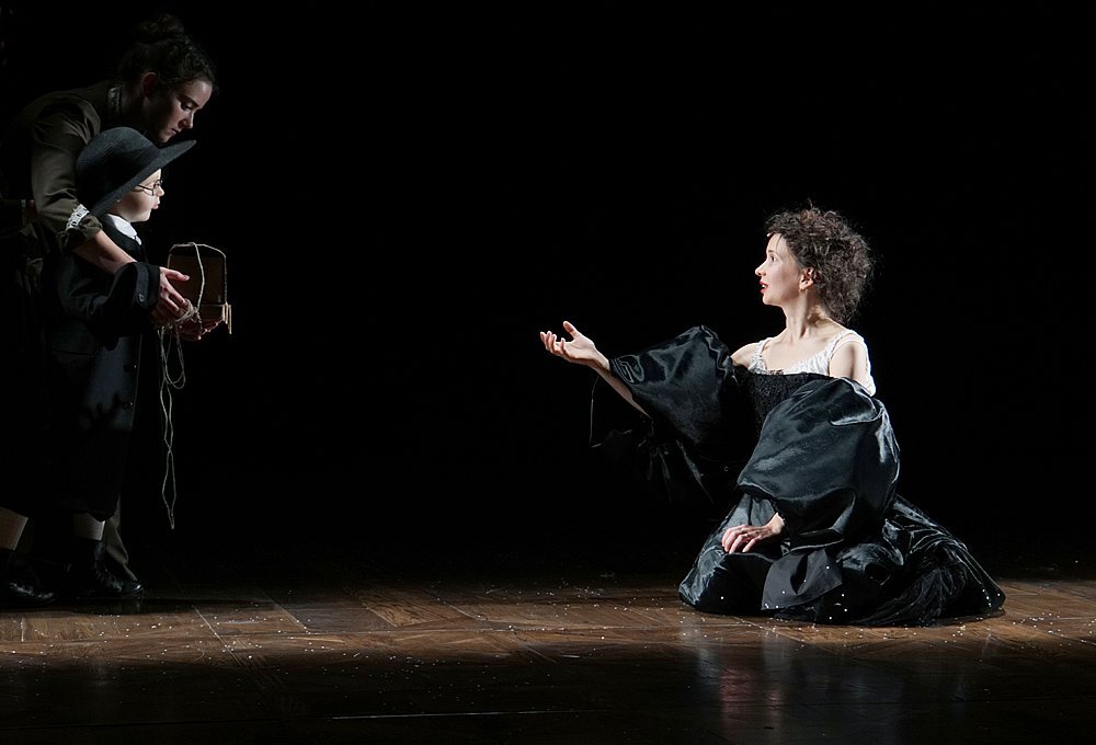 Текст Толстого не звучит со сцены, единственное обращение к театральной «классике» — шутки про МХАТовскую «Анну Каренину» 1937 года, судорожное чтение пыльного сценария и подсказки от суфлёра. На самом деле, это попытка найти решение проблемы в сценарии культового спектакля. А что же делать? Столько постановок, а Каренину до сих пор не «спасли».