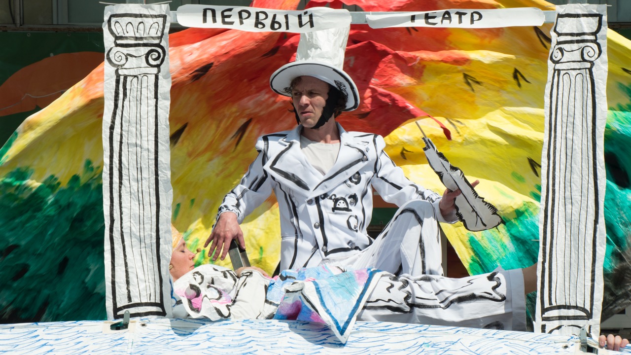 Устюгова: Мы занимаемся уличным театром, потому что нам кажется, что у бэби-театра и уличного театра много общего. Прежде всего, отношение к зрителям и способ существования на сцене. То есть и там, и там актёр должен быть естественным и стараться вызвать доверие у зрителя. И там, и там зритель становится главным в спектакле. В уличных спектаклях мы как раз реализуем свои нереализованные желания и те вещи, которые мы сами очень любим в театре. Например, большие объекты, большие летающие куклы. На маленькой площадке мы их тоже используем, но они не создают такого впечатления, не имеют такого эффекта, как на улице.