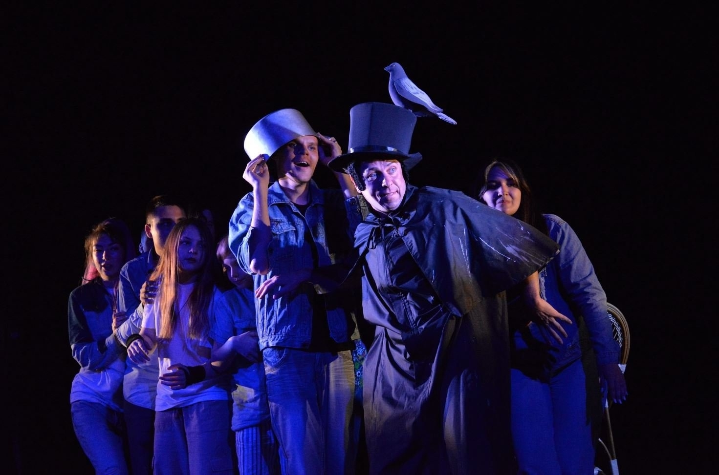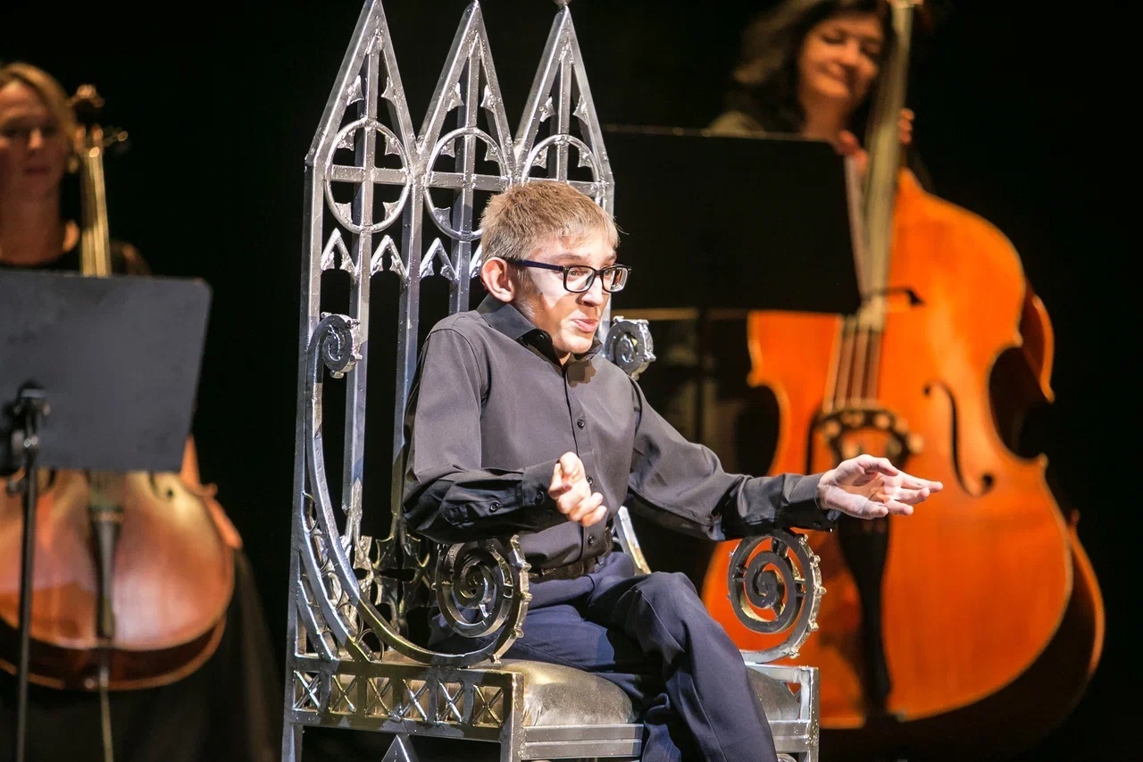 А вторым победителем прошлого года стала постановка петербургской театральной студии «Светлячки» – «Вовка в тридевятом царстве». Это небольшой моноспектакль в сопровождении маленького оркестра (скрипка, гобой, фортепиано, виолончель и контрабас). Музыка здесь почти полноправный партнёр героя, она будто подхватывает и оберегает его во всех перипетиях. Даниил Гончар очень органично сочетает в роли обаяние, торопливость и мечтательность.