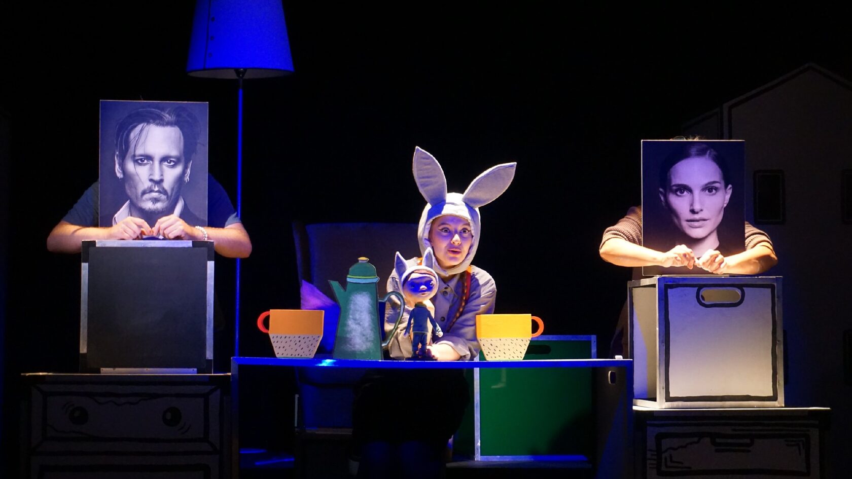 «Большое Ухо» Марии Кузнецовой – история девочки, потерявшей слух в семь лет после менингита. Действующих лиц трое – сама девочка, называющая себя Большое Ухо, и её родители. Исполнительница главной роли сопровождает свой рассказ переводом на РЖЯ, реплики остальных персонажей дублируются на небольшом экране в правом углу сцены в стиле фраз из комиксов. Основные роли здесь полностью сыграны живым планом, куклы не столько берут эмоции на себя, сколько дополнительно иллюстрируют их. Но второстепенных персонажей отыгрывают куклы. Очень выразительны головы школьных учительниц. Голова первой учительницы, из специализированной школы – большая, прямоугольная, статичная – вызывает ощущение уюта, надёжности, защищённости. Учительница в обычной школе, куда родители отправили дочь после обретения навыка чтения по губам, совсем другая: маленькая голова на тонкой, по-змеиному извивающейся шее, при всей благожелательности на словах, будто сама излучает ту угрозу, которая позже будет исходить от одноклассников с их насмешками над слуховым аппаратом. И если мимика первой учительницы легко читаема, движения глаз и губ предельно чёткие, то мимика учительницы из обычной школы, которая постоянно вертит головой, отвлекаясь на кого-то, кажется абсолютно неуловимой. Ценно, что, вернувшись с первого занятия в специализированной школе, девочка проговаривает родителям правила общения с человеком, который читает по губам. Родители стараются поддерживать дочку во всём, постоянно будто обволакивают её своей любовью. И хотя тема буллинга и попытки принятия своей особенности через игру в супергероиню звучит очень болезненно, защитный кокон, ждущий её дома, смягчает все проблемы героини, делает их вполне преодолимыми. А когда в её жизни появляется подруга Марта, свободы самовыражения становится ещё больше. Любопытно, как это «расширение» показано через образы: когда девочки впервые встречаются на улице, их куклы – небольшие марионетки. А в сцене весёлой совместной ночёвки задействованы уже совсем другие: к небольшому кубику пристёгнуты большие мягкие руки, ноги и голова. На своей территории, в пространстве уже укрепившейся дружбы, девочки могут спокойно занимать больше места, смелее проявлять себя. С таким опытом полного принятия и поддержки от мира можно решиться и на собственный видеоблог. Конечно, рассказанная история никак не умещается в заявленный в начале формат «прямого эфира». Рассказчица свободно перемещается во времени и пространстве, театральные средства выразительности дают намного больше возможностей показать мир детского воображения (не только посредством кукол), чем могла бы дать домашняя камера. Но эта условность повествования ничуть не мешает спектаклю быть искренним, живым и очень красивым.
